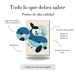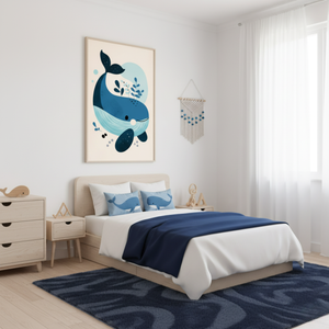 Ballena Minimalista en Fondo Azul Suave – Arte Infantil con Inspiración Marina