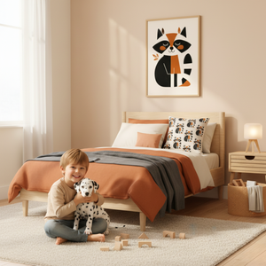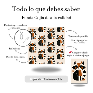 Cojín Estampado Mapache Sentado en Estilo Minimalista – Decoración Infantil Natural con Toques del Bosque