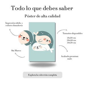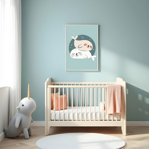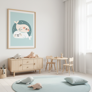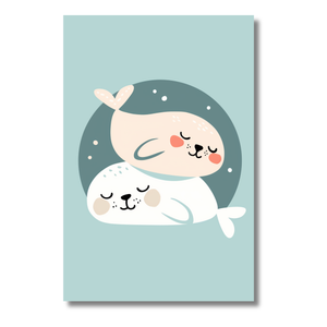 Mamíferos Marinos Abrazados en Estilo Minimalista – Cuadro Infantil con Foca y Cría