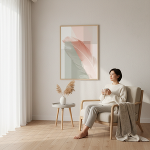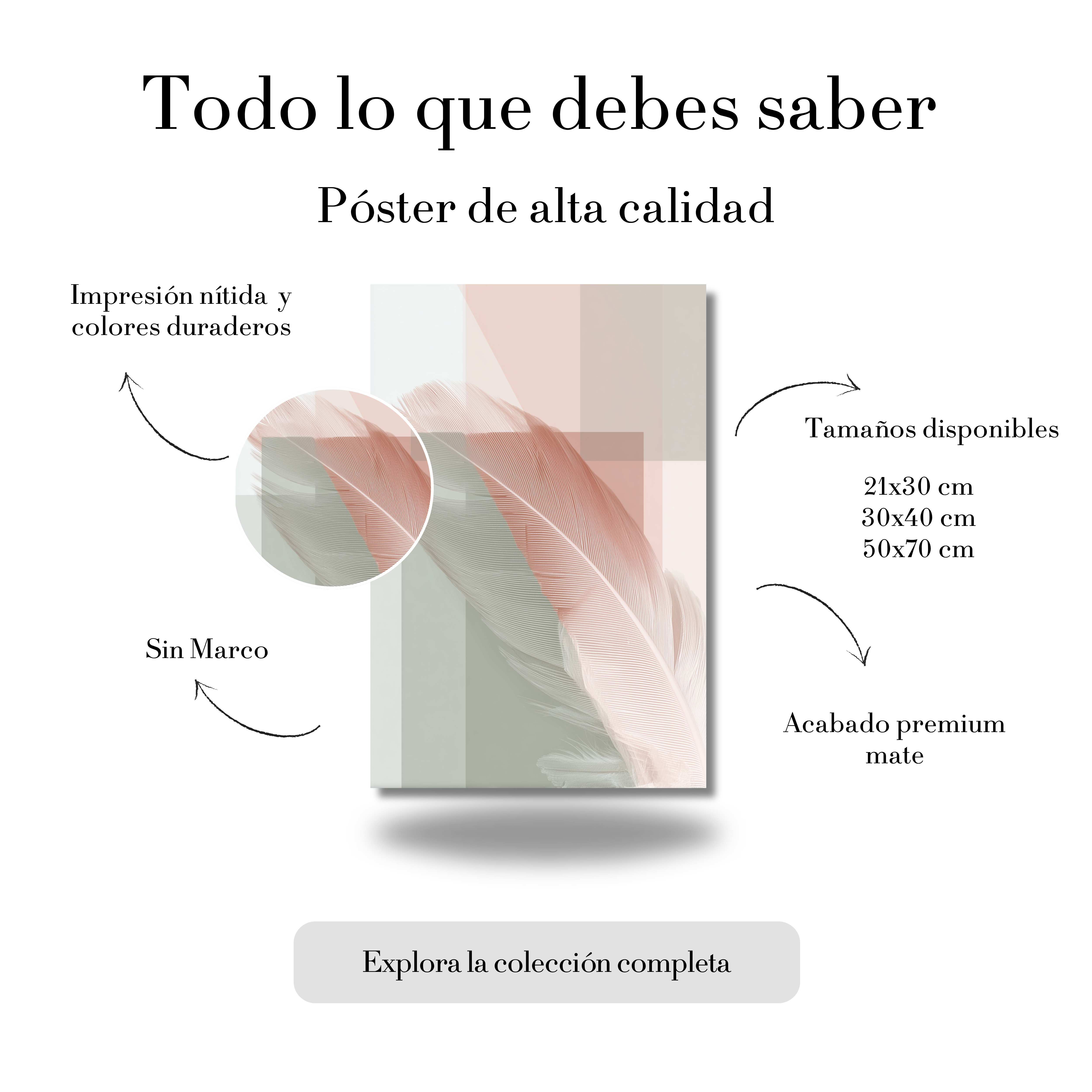 Pluma Rosa sobre Fondo Geométrico – Póster Minimalista en Tonos Suaves